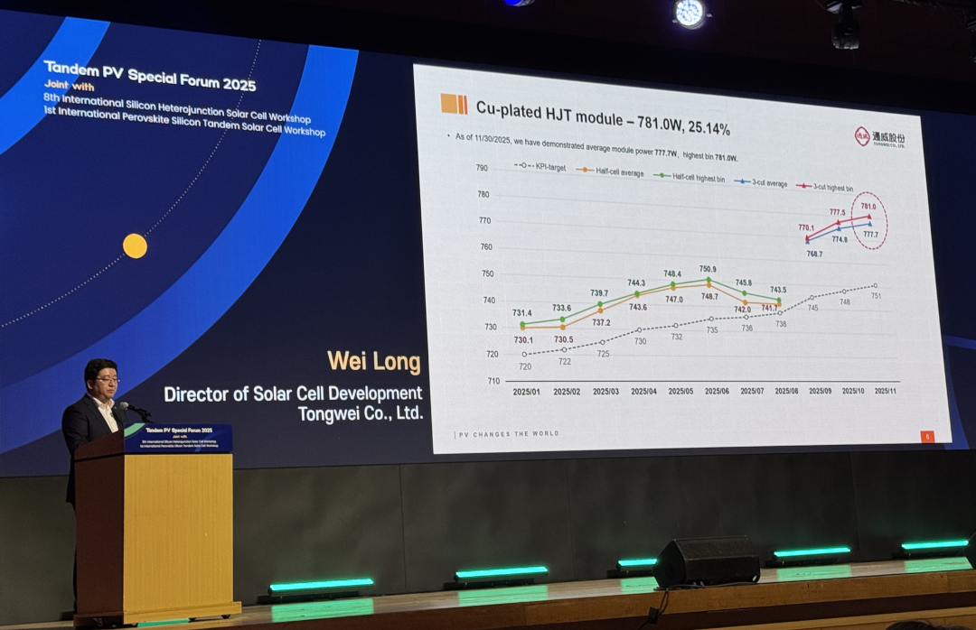From December 1 to 3, the 8th International Silicon Heterojunction Solar Cell Workshop and 1st International Perovskite Silicon Tandem Solar Cell Workshop, along with the Tandem PV Special Forum 2025, were held in Daejeon, South Korea. The event was jointly organized by SNEC, the Korea Institute of Energy Research (KIER), and the Forschungszentrum Jülich from Germany. Dr. Long Wei from the PV Technology Center of Tongwei Co., Ltd. was invited to deliver a keynote speech, showcasing Tongwei's leading achievements and industrialization strategies in heterojunction (HJT) technology to the global PV industry.